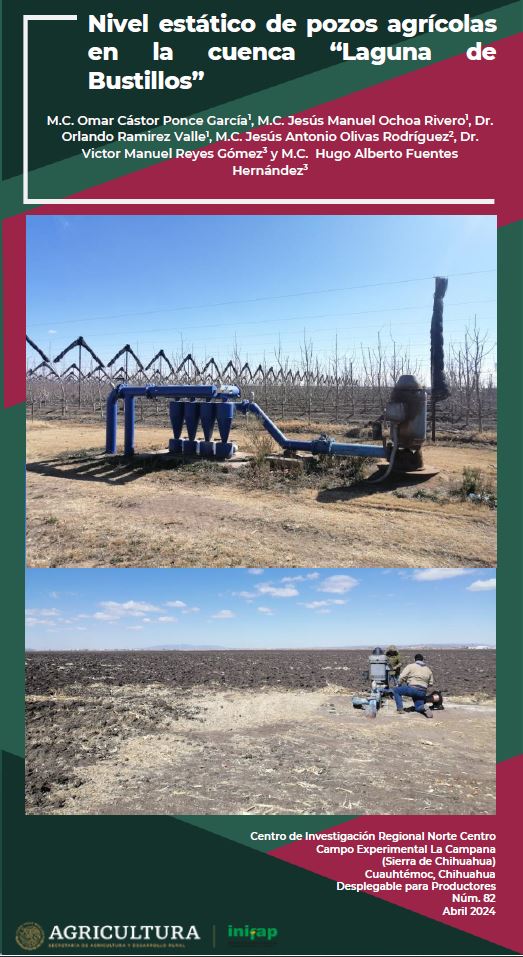 La cuenca Laguna de Bustillos es una cuenca cerrada o endorreica (corrientes de agua terminan en una laguna y no hacia el mar). La cuenca se ubica al noroeste del estado de Chihuahua, principalmente en el municipio de Cuauhtémoc y secciones menores de los municipios de Riva Palacio, Bachíniva, Cusihuiriachi y Guerrero. Por debajo de la cuenca se encuentra el acuífero “Cuauhtémoc”, considerado como uno de los más explotados a nivel nacional. Esto se debe a la alta producción agrícola bajo riego con agua subterránea, principalmente de maíz y manzano, y también a la disminución de la precipitación en la zona, provocado por el cambio climático. Por lo anterior, el presente desplegable tiene la finalidad de dar a conocer los efectos del abatimiento del acuífero en el nivel estático del espejo de agua (profundidad a la que se encuentra el agua antes de su extracción en los pozos agrícolas).