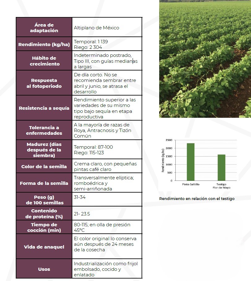 Produce un rendimiento promedio de grano siendo este de 2,304 kg/ha en riego y 1,139 kg/ha en temporal, además es tolerante al ataque de la mayoría de las razas de roya, antracnósis y tizón común.