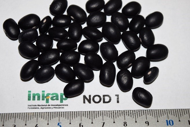 En la madurez las vainas se tornan amarillas, el tipo de crecimiento de NOD 1 es indeterminado trepador con guías cortas de crecimiento lento, la altura promedio del dosel de esta variedad fue de 52cm y la longitud de la guía puede alcanzar 103 cm, el color de fondo del grano es negro con tonalidad opaca y el hilio es del mismo color.